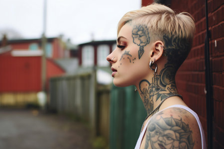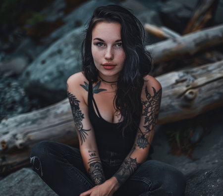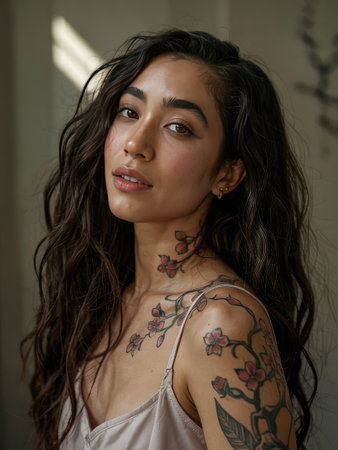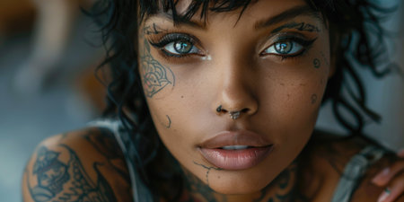 Close-up portrait of a beautiful young woman with tattoos on her arms and chest