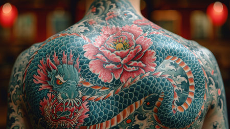 Close-up image of an intricate, colorful tattoo featuring a dragon and floral motifs on a person's back, symbolizing art and craftsmanship.