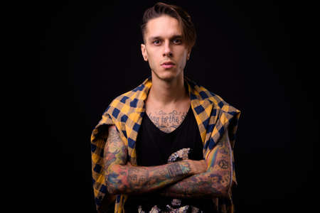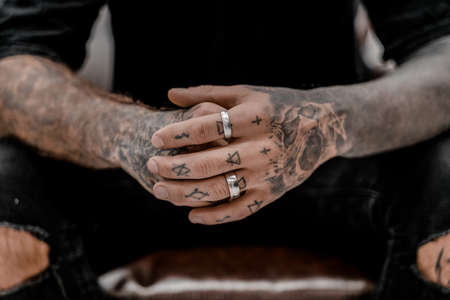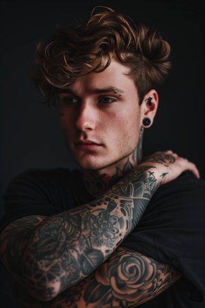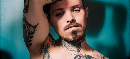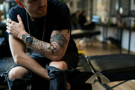 Young handsome man in casual outfit and with various tattoos on body posing and looking at camera.