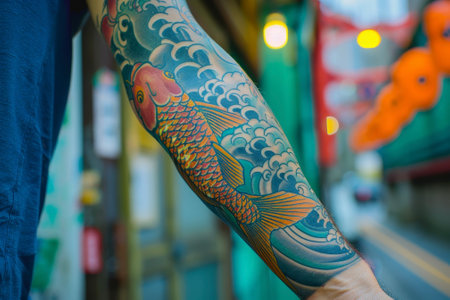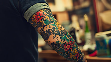 A vivid representation of body art, this image features a tattooed arm adorned with intricate floral and wave motifs, captured in a lively tattoo studio setting.