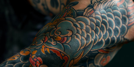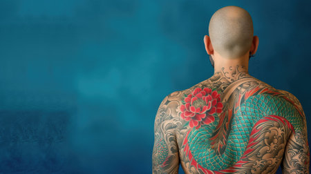 A man's back adorned with a colorful and intricate traditional Japanese tattoo, symbolizing artistry and tradition