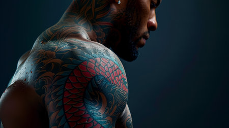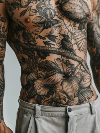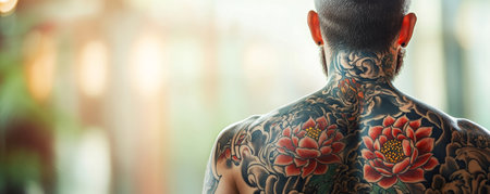 Man with colorful back tattoos of flowers and leaves in natural light, artistic expression concept
