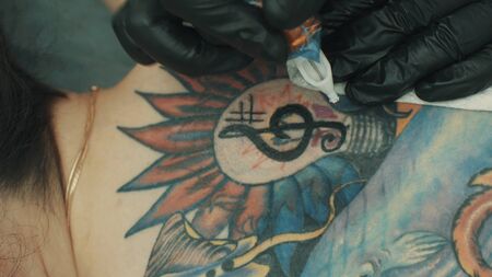 Close up of professional tattooer artist. Tattoo art on body. Equipment for making tattoo art. Master makes tattooed in studio.