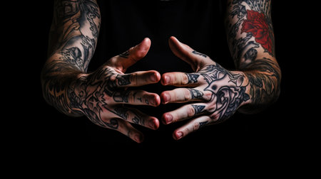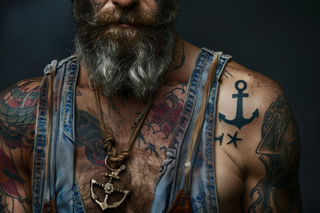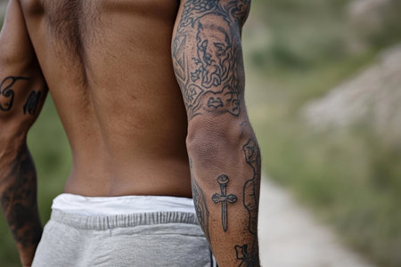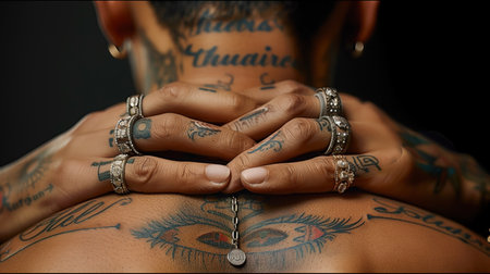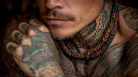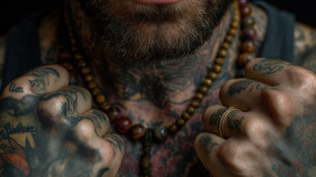 Intricate close-up of a tattooed man displaying detailed ink work, gripping a necklace with a meaningful expression that reflects depth and character.