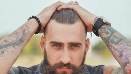 Street portrait of a handsome man hipster model with hairstyle and beard with a tattoo on his neck in a fashionable leather jacket and hoodie walks in the city