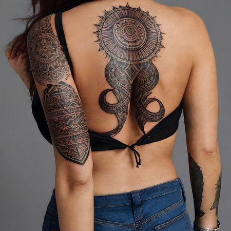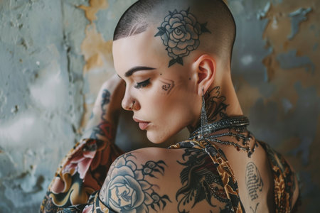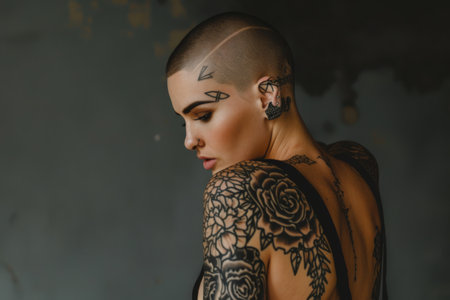 A woman showcasing intricate tattoos adorning her back, highlighting her unique body art and personal expression, A fierce lady model with a shaved head and intricate tattoos, AI generated