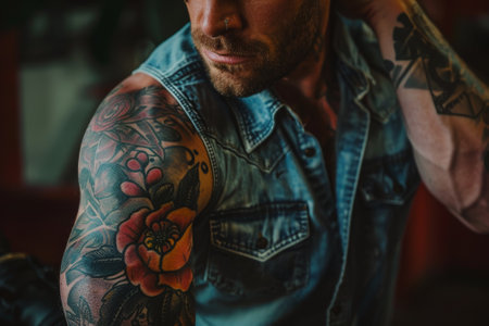A man with a well-defined physique displays his intricate floral tattoo on his arm. He is dressed in a denim vest, highlighting the vibrant colors of the ink in a cozy, inviting environment.