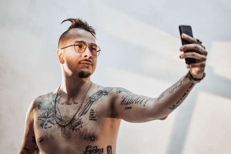 Crazy stylish male with tattooed naked body in sunglasses takes a selfie photo in a studio against the white wall