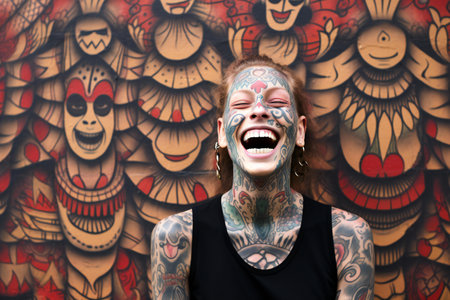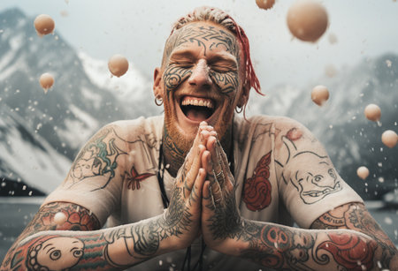 This striking close-up captures the intricate tattoos of a man adorned with a unique necklace. The image emphasizes the artistry of body ink and personal style, showcasing individuality in a lively setting.