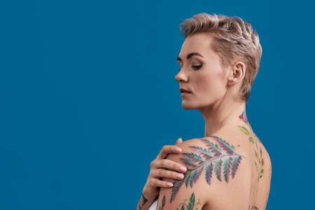Beauty portrait of a young attractive half naked tattooed woman with perfect skin looking down, holding hand on her shoulder isolated over blue background