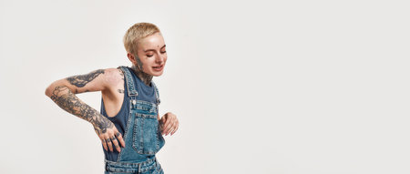 Tattoo and piercing. A white tattooed pierced woman dancing alone wearing a denim overall moving her hands and smiling