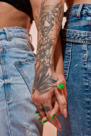 Closeup of two young lesbian women in denim jeans holding each other hand, standing together isolated over light pink background