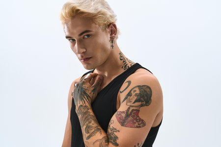 Young man with tattoos and a trendy outfit poses confidently against a light background.