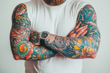 Crossed muscular arms adorned with vibrant floral tattoos stand out against a plain backdrop, while a stylish wristwatch enhances the expression of individuality.