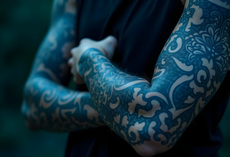 Elaborate patterns in blue ink adorn muscular arms crossed confidently. The intricate tattoos blend artistry with personal expression, highlighting a unique aesthetic against a natural backdrop.