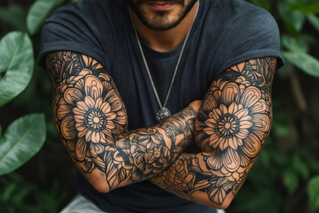 Tattooed man displaying arms adorned with intricate floral mandala tattoos, showcasing body art that reflects personal style and cultural tradition