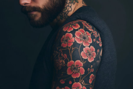 Close up view of a bearded man showcasing a vibrant Japanese style cherry blossom tattoo that elegantly covers his arm and shoulder