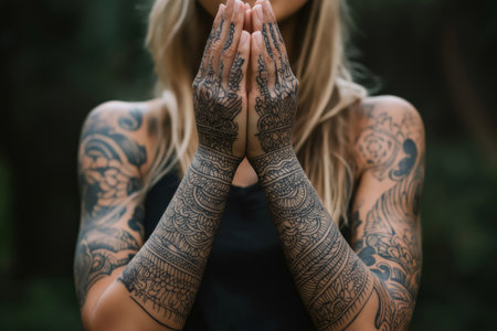 Caucasian tattooed woman joining hands in a meditative pose, showing traditional sak yant tattoos