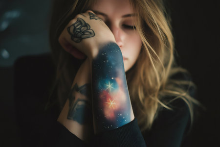 Portrait featuring a blonde model proudly displaying her vibrant, colorful space tattoo on her forearm, showcasing intricate designs of galaxies and stars