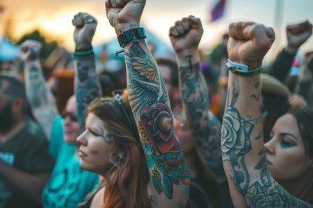 Tattooed fans raising their fists in solidarity --ar 3:2 Job ID: 12864866-ddbb-42f4-9a19-2ae7d3339065