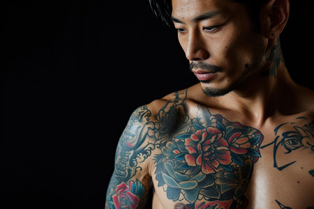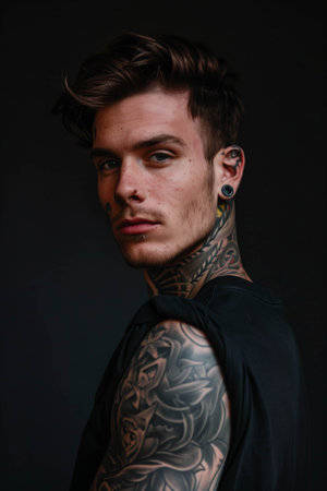 A captivating portrait of a young man adorned with intricate tattoos, showcasing personal expression and cultural heritage, captured in soft, warm lighting.