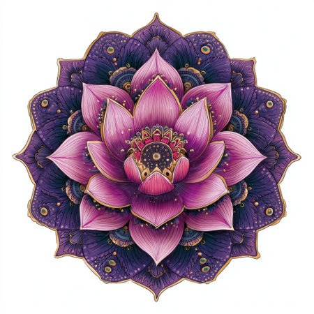 This stunning purple lotus flower mandala features intricate patterns and vibrant colors, symbolizing beauty, serenity, and tranquility in nature.