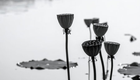 Lotus seed pod silhouettes against pale pond airy spacing minimal reflections representing botanical calm suitable for wellness education and design
