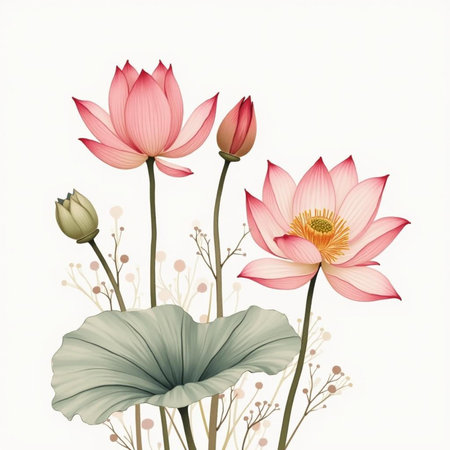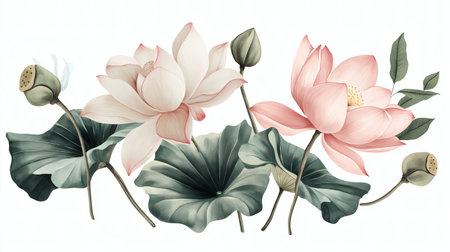 A beautifully detailed illustration of pink and white lotus blossoms, accompanied by buds and large green leaves, creating a serene and harmonious composition. This artwork captures the grace and subtle elegance of lotus flowers in a tranquil botanical setting.