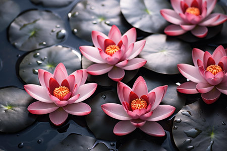 A stunning overhead view of delicate pink water lilies floating on a tranquil blue pond, surrounded by green lily pads, creating a serene and calming atmosphere.
