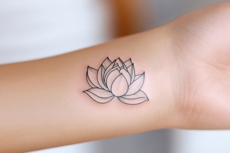Minimalist lotus flower tattoo on a woman's wrist, symbolizing purity, enlightenment, and rebirth