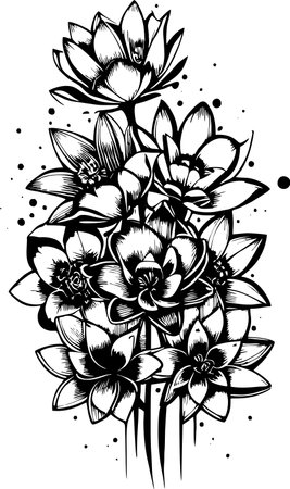 black graphic contour drawing of a bouquet of flowers on a white background, design