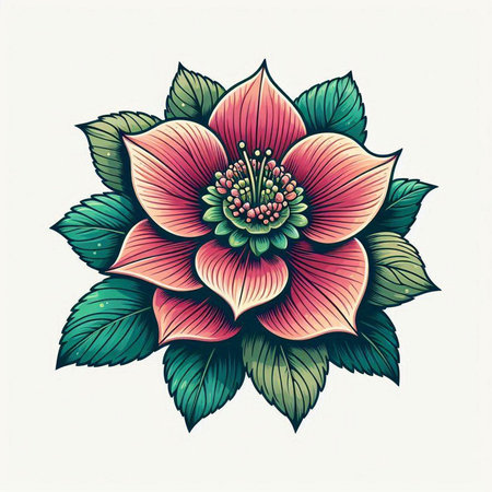 Vector illustration of a red flower with green leaves on a white background.