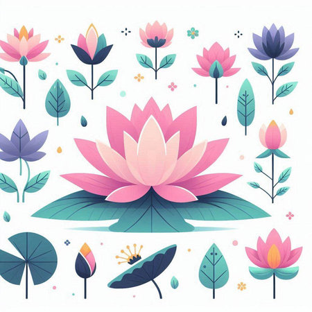 Lotus flower with leaves and flowers. Vector illustration in flat style.