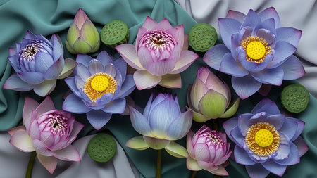 With showing a serene arrangement of blooming lotus flowers in various shades of purple pink and blue with green seed pods scattered amongst them on a teal draped...