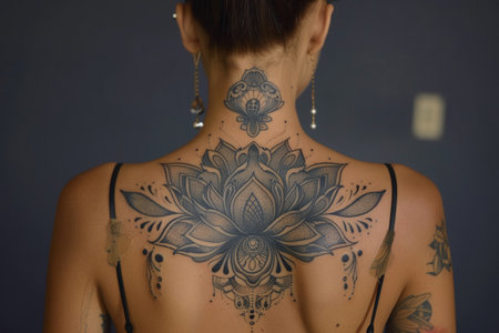 Woman showing large ornamental lotus flower tattoo on back