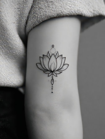 A stunning black and white tattoo featuring a lotus flower design on the arm, symbolizing beauty and spiritual growth, showcasing intricate detail and artistry.