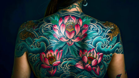 An AI generated illustration of a woman's back with an East Asian traditional lotus and tiger tattoo