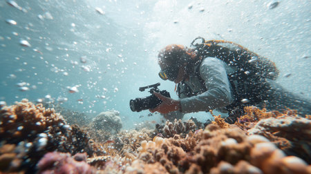 Scuba diver holding an underwater camera, capturing the beauty of a jellyfish gracefully drifting in the ocean, with the sun's rays filtering down