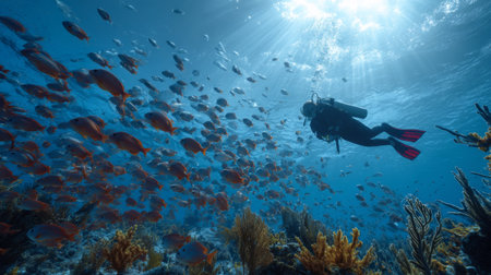Sunlight illuminates a scuba diver gracefully swimming above a colorful coral reef, surrounded by a school of fish in the clear blue ocean, creating a serene underwater scene