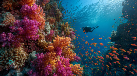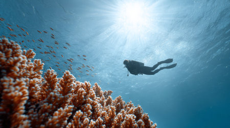 Sunlight illuminates a scuba diver swimming gracefully above a colorful coral reef, teeming with marine life and diverse coral formations in a breathtaking underwater seascape