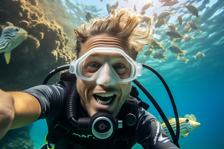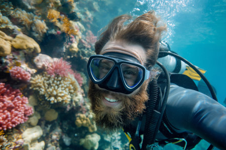 Underwater shot of a smiling male diver with a vibrant coral reef backdrop