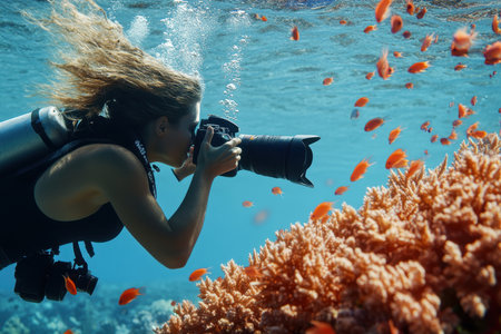 Female diver is exploring the vibrant and diverse underwater life found in a stunning aquatic environment. Generative AI