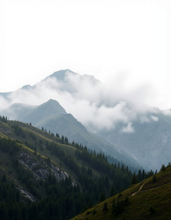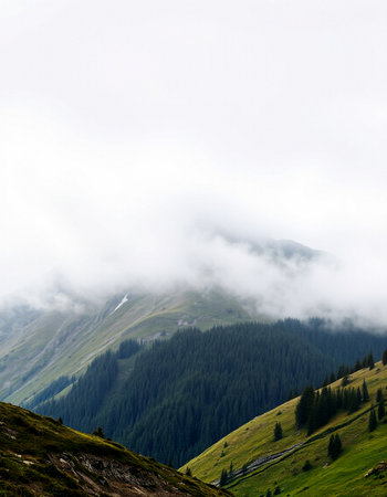 Mountains and forest in the fog on a cloudy day, Switzerland