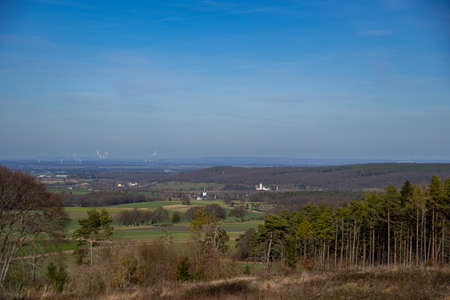 Sunset in the Hills of Franconia, Germany on an early April evening. Barren trees in the forrest. Panorama Format. Rural Countryside. Mountain Chapel and Castle
