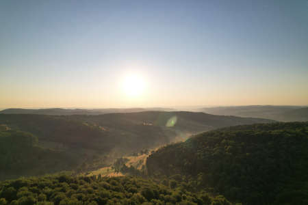 A beautiful shot of brown trees and greenery on hills and mountains in the countryside at sunset