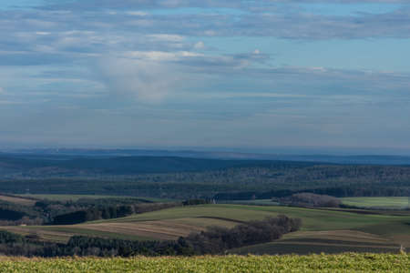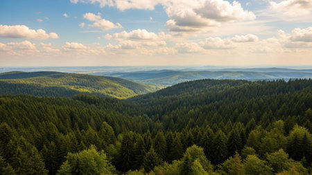 View from the forest over the mountains with clouds on the sky in the bavarian forest