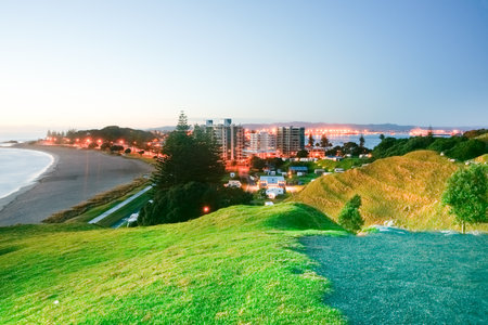 As sunrises while lights still on in town from slope on Mount Maunganui, Tauranga New Zealand.