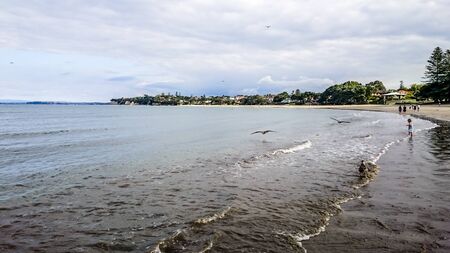 Auckland, New Zealand - February 11, 2016: People enjoying the cloudy day on Takapuna beach, Auckland, New Zealand.