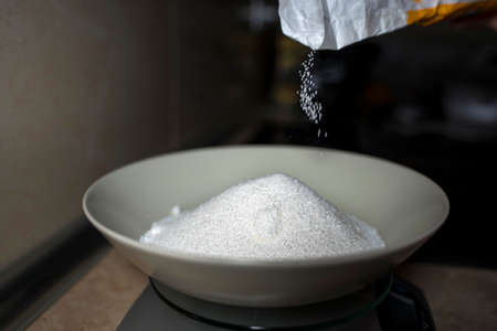 Pouring sugar into a deep plate. Close-up. Homemade cook.
