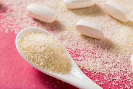 Hydrolyzed and co-compressed collagen, on pink background, top view